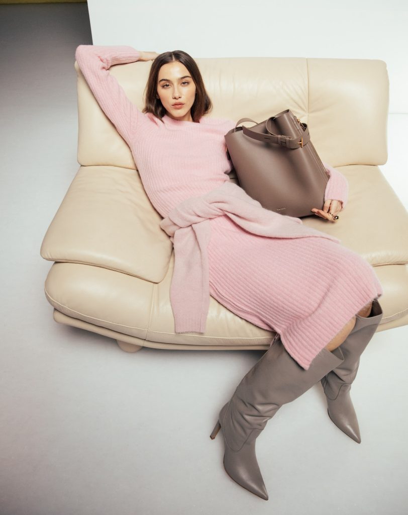 Rolul-cheie îl joacă accesoriile într-o nuanță contrastantă de taupe-gri. Cizmele înalte cu vârf ascuțit de la Gino Rossi și geanta minimalistă din aceeași linie echilibrează perfect baza pastelată și adaugă întregii ținute profunzime modernă și rafinament. Este un exemplu excelent despre cum accesoriile bine alese pot defini un look și pot transforma o rochie simplă, confortabilă, într-o apariție mult mai fashion-forward.